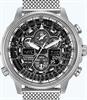 Citizen Eco-drive Navihawk A-T Flight Chronograph model JY8030-83E. Watch Functions: Atomic Timekeeping with Radio Controlled Accuracy; Receives radio signals both automatically and on-demand in North America, the United Kingdom, Europe, Japan and China; Chronograph; 99 Minute Countdown Timer; Perpetual calendar; Analog/Digital Display; Time and calendar in 43 Cities; Multiple Alarms; 1/100 Second Chronograph; UTC display; shock sensing function. Stainless steel case with E6B slide rule scale and compass scale on the bezel. Black dial with luminous hands and markers. Steel mesh bracelet. 200m water resistant.