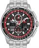 Citizen Eco-drive Red Arrows Skyhawk A-T Flight Chronograph model JY8059-57E. Watch Functions: Atomic Timekeeping with Radio Controlled Accuracy; Receives radio signals both automatically and on-demand in North America, the United Kingdom, Europe, Japan and China; Chronograph; 99 Minute Countdown Timer; Perpetual calendar; Analog/Digital Display; Time and calendar in 43 Cities; Multiple Alarms; 1/100 Second Chronograph; UTC display; shock sensing function. Stainless steel case with E6B slide rule scale and compass scale on the black and red bezel. Black dial with RAF Red Arrows emblem, luminous hands and markers. Stainless steel bracelet. 200m water resistant.