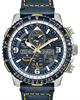 Citizen Eco-drive Promaster Skyhawk A-T Flight Chronograph model JY8078-01L. Watch Functions: Atomic Timekeeping with Radio Controlled Accuracy; Receives radio signals both automatically and on-demand in North America, the United Kingdom, Europe, Japan and China; Chronograph; 99 Minute Countdown Timer; Perpetual calendar; Analog/Digital Display; Time and calendar in 43 Cities; Multiple Alarms; 1/100 Second Chronograph; UTC display; shock sensing function. Stainless steel case with E6B slide rule scale on the blue bezel. Blue dial, luminous hands and markers. Blue leather strap. 200m water resistant.