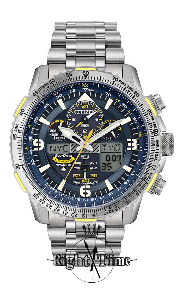 Citizen Eco-drive Promaster Skyhawk A-T Blue Angels Flight Chronograph model JY8101-52L. Watch Functions: Atomic Timekeeping with Radio Controlled Accuracy; Receives radio signals both automatically and on-demand in North America, the United Kingdom, Europe, Japan and China; Chronograph; 99 Minute Countdown Timer; Perpetual calendar; Analog/Digital Display; Time and calendar in 43 Cities; Multiple Alarms; 1/100 Second Chronograph; UTC display; shock sensing function. Titanium case with E6B slide rule scale on the blue bezel. Blue dial, luminous hands and markers. Titanium bracelet. 200m water resistant.
