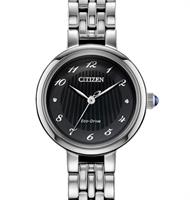 Citizen ladies L Classic watch model EM0990-81E with quartz movement that never needs a battery - it runs on light! Steel case and bracelet. Black dial with Arabic numerals.