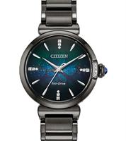 Citizen L May Ladies wrist watch. Model EM1067-53E inspired by the patiently formed layers of Earth`s crust. Eco-drive movement. Black PVD plated stainless steel case and watch bracelet. The crystalline-like gradient blue dial features diamond accents and quickly evokes the layers of the Earth, while a sapphire crystal above adds clarity to the display`s details. 50 meters water resistant