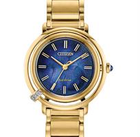 Citizen L Arcly style Ladies wrist watch. Model EM1099-57L. Eco-drive movement. Stainless steel gold plated case and watch bracelet, gorgeous blue dial. 50 meters water resistant