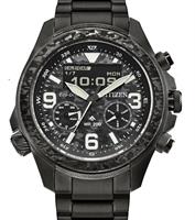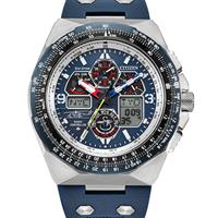 Citizen Promaster Sikorsky chronograph model JY8156-00L. Stainless steel case with blue rubber band. World time in 43 cities, Atomic Timekeeping, Dual Time, Timer, Perpetual calendar.