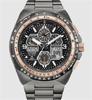 Citizen Promaster Skyhawk A-T chronograph model JY8146-54E. Stainless steel grey plated case with bracelet. World time in 43 cities, Atomic Timekeeping, Dual Time, Timer, Perpetual calendar.