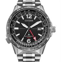 Citizen Promaster Air NB6046-59E powered by Citizen automatic movement. Stainless Steel case, rotating black 24-hours bezel, black dial with luminous markers, GMT hand, and date calendar. Bracelet. Water resistant to 200 meters