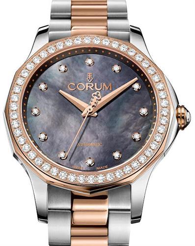 Corum Admiral`s Cup Legend watch model A082/02817 powered by Swiss automatic movement. Stainless steel case with solid rose gold bezel and 50 diamonds (1.48 ct) around the bezel. Sapphire crystal on front and back. Black mother-of-pearl dial with 12 diamond markers. Stainless steel and solid 18kt rose gold bracelet.