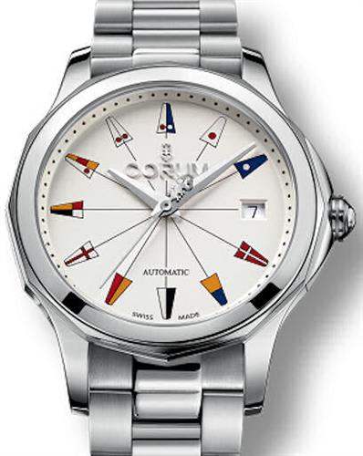 Corum Admiral`s Cup Legend Lady 38 watch model A082/02888 powered by Swiss automatic movement. Stainless steel case. Sapphire crystal. White dial with printed nautical flags as markers. Steel bracelet