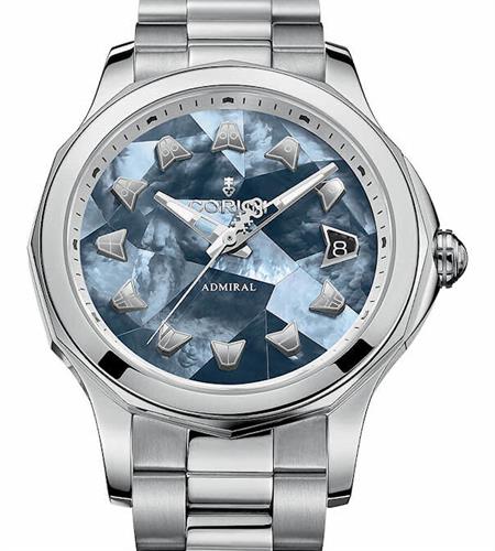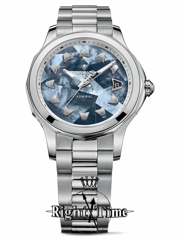 Corum Admiral Legend 38 model A082/03584 powered by Swiss automatic movement. Stainless steel case with sapphire crystal on front and back. Gorgeous marquetry blue Mother-of- pearl dial with date and silver color nautical flags as markers would remind you of an ocean.