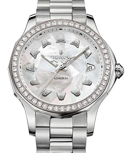 Corum Admiral 38 watch model A082/03780 powered by Swiss automatic movement. Stainless steel case and bracelet. Diamond bezel. Sapphire crystal. Mother-of-Pearls dial with nautical flags as markers and date calendar.