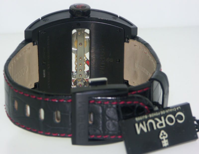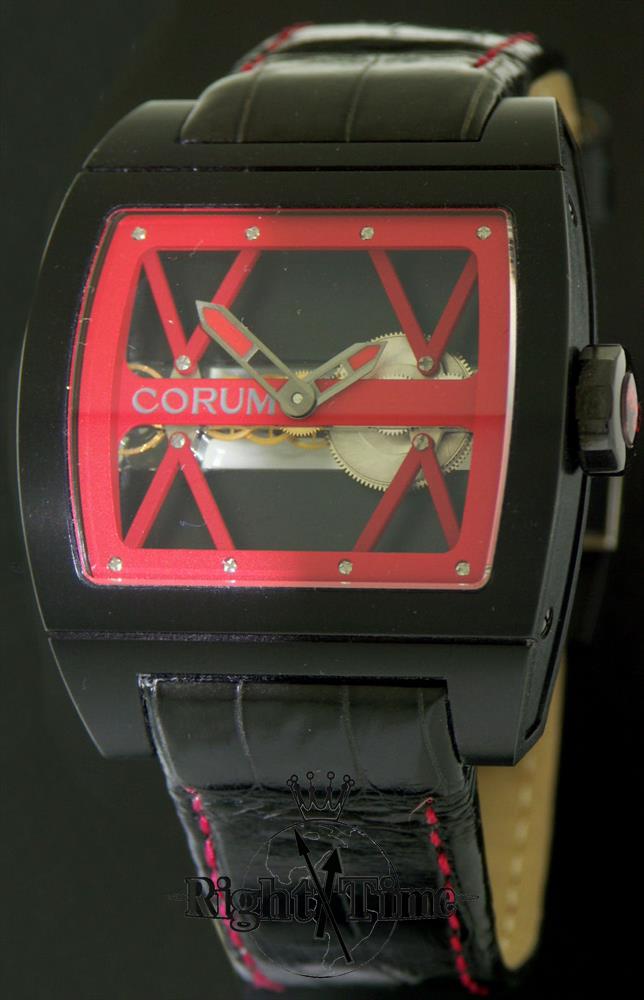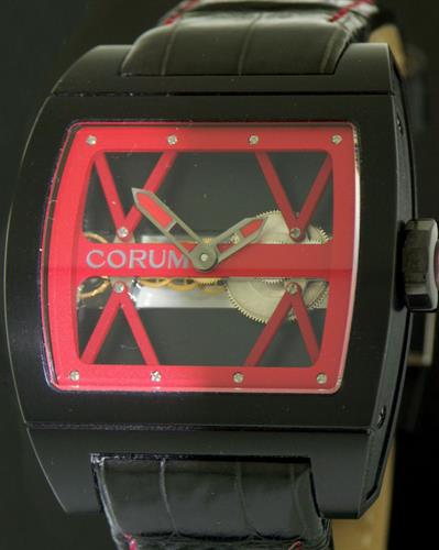 Corum GOLDEN BRIDGE watch model b007/02363 powered by Swiss manual wind Corum movement. The iconic Corum timepiece since 1980. Black DLC plated titanium case. Sapphire crystal. Bridge construction partial dial. Black with red alligator leather strap.