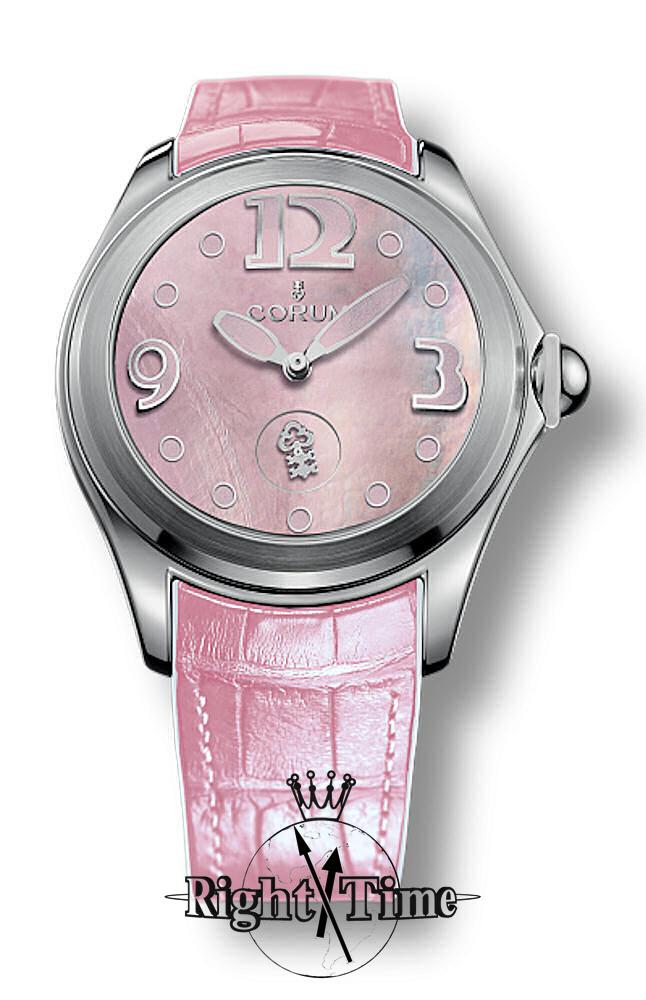 Corum Heritage Bubble Watch model L295/03048 powered by 30 jewels Swiss automatic Frederic Piguet Cal.1160 movement. Stainless steel 42mm case. Sapphire crystal on front and back. Pink Mother-of-Pearl dial with Arabic numerals, pink Superluminova coating and small seconds sub-dial designed as a rotating key at 6 o`clock. Pink leather strap. Water resistant to 100 meters