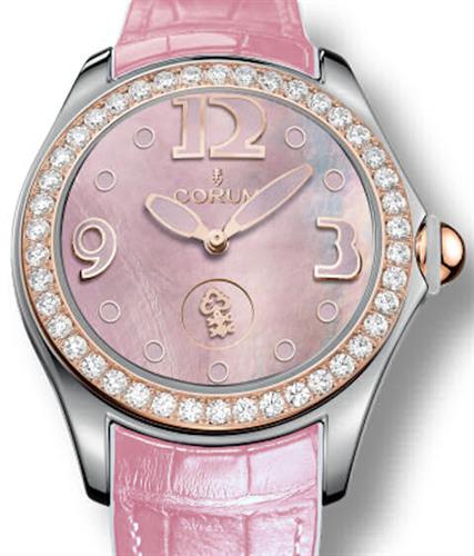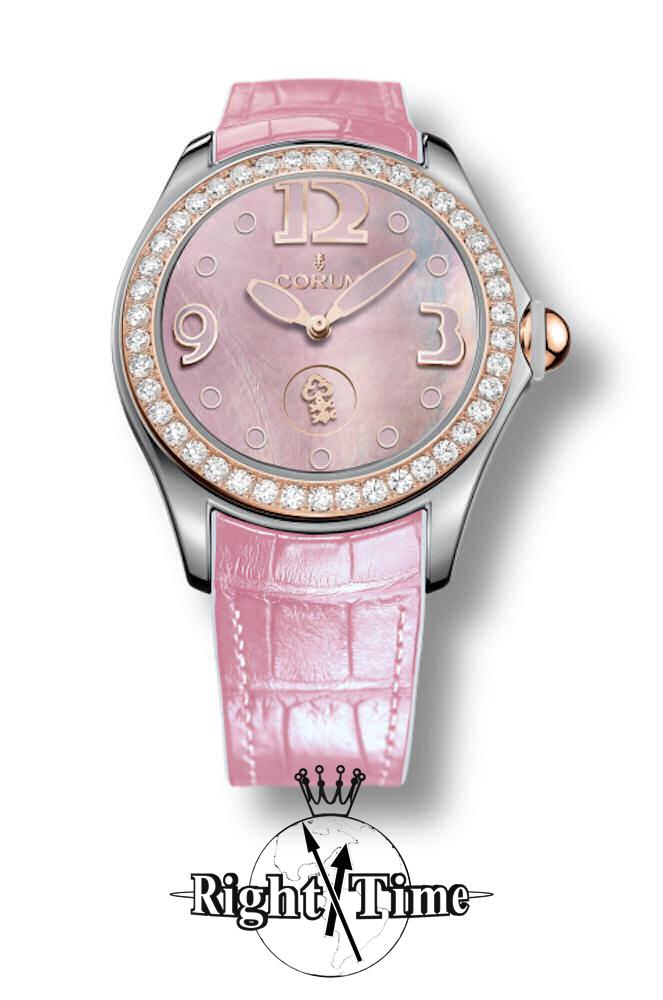 Corum Heritage Bubble Watch model L295/03051 powered by 30 jewels Swiss automatic Frederic Piguet Cal.1160 movement. Stainless steel 42mm case. 18kt rose gold bezel and crown. Sapphire crystal on front and back. 50 VS full-cut diamonds (1.47 ct). Pink Mother-of-Pearl dial with Arabic numerals, pink Superluminova coating and small seconds sub-dial designed as a rotating key at 6 o`clock. Pink leather strap. Water resistant to 100 meters
