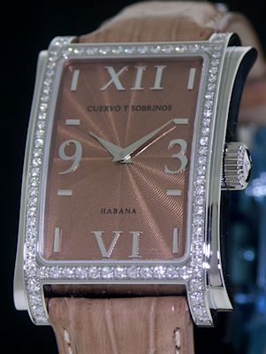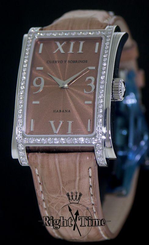 Cuervo Y Sobrinos Prominente ladies Havana quartz model with stunning unique cognac textured color dial and matching color alligator strap. Polished stainless steel curved case set with 1.30 carat total weight of VVS1 quality diamonds. Comes in unique cigar humidor box