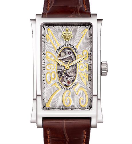 Cuervo Y Sobrinos Prominente Iconico Squelette Model 1012.1SQ2. Classic timeless elegant automatic watch in stainless steel curved case to perfectly fits your wrist with bracelet. Silver color dial with large golden Arabic numerals. Comes in unique cigar humidor box. Limited Edition of 28 pieces