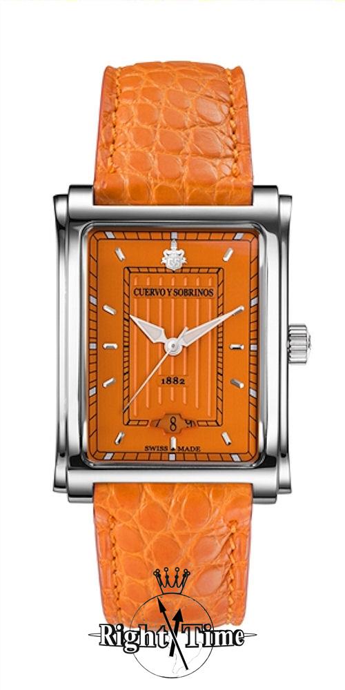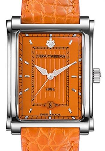 Cuervo Y Sobrinos Prominente Caramelo Model 1015.1OR. Classic timeless elegant automatic watch in stainless steel curved case to perfectly fits your wrist. Orange color dial. Orange Louisiana alligator band