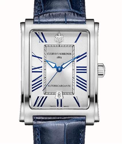 Cuervo Y Sobrinos Prominente Clasico Model 1015.1RAB. Classic timeless elegant automatic watch in stainless steel curved case to perfectly fits your wrist. Silver color dial with Roman numerals. Blue Louisiana alligator band