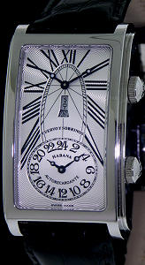 Cuervo Y Sobrinos Prominente Dual time Model 1124.1AG. Classic timeless elegant automatic watch in stainless steel curved case to perfectly fits your wrist with bracelet. Textured silver dial with large Arabic numerals, day/date calendar and second time zone sub-dial. Black Alligator leather strap. Comes in unique cigar humidor box