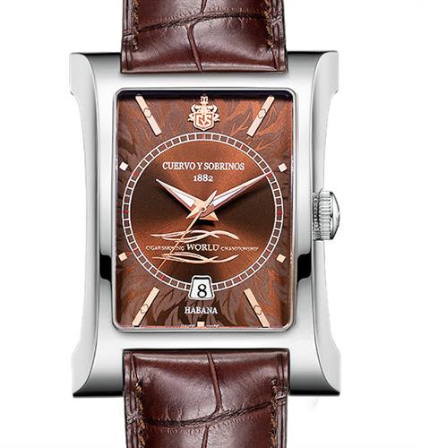 Cuervo Y Sobrinos Esplendidos Cigar Smoking World Championship (CSWC) Series. Model 2414.1TCSWC. Classic timeless elegant automatic watch in stainless steel case with Louisiana alligator strap. Limited Edition. Comes in unique cigar humidor box
