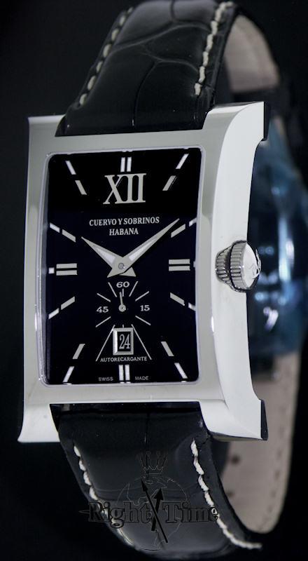 Cuervo Y Sobrinos Esplendidos Pequenos segundos Model 2415.1NGL. Classic timeless elegant automatic watch in stainless steel case with Louisiana alligator strap. Comes in unique cigar humidor box