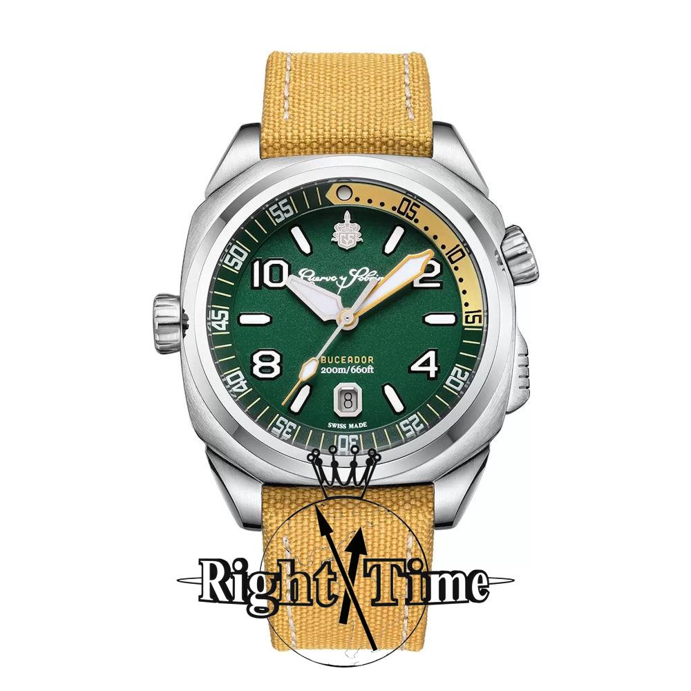 Cuervo Y Sobrinos Buceador Caribe Model 2860.1V. Water resistant to 200 meters. Swiss automatic watch in stainless steel case. Sapphire crystal. Comes on a yellow mustard and green Cordura strap with an additions green leather strap. Green color dial with date calendar and luminous Arabic numerals.
