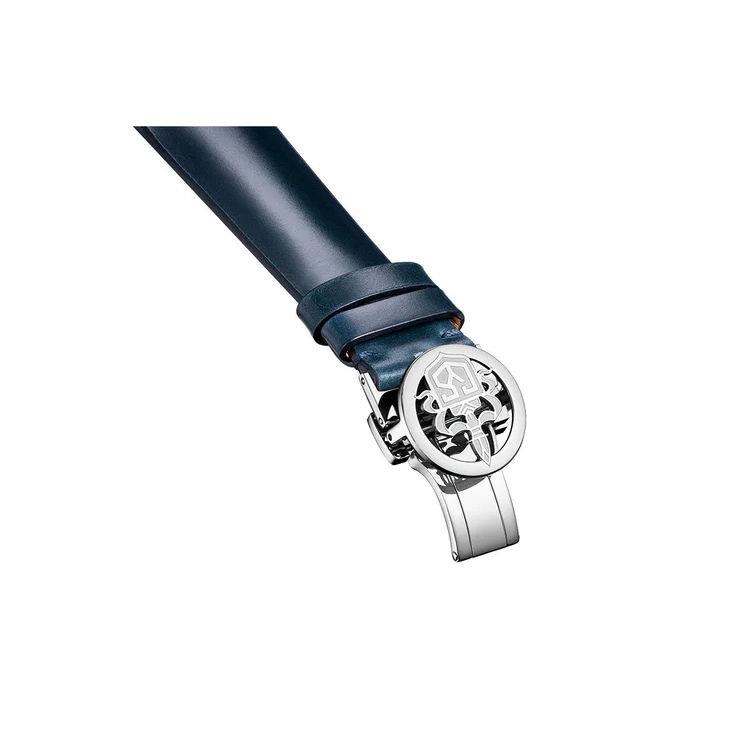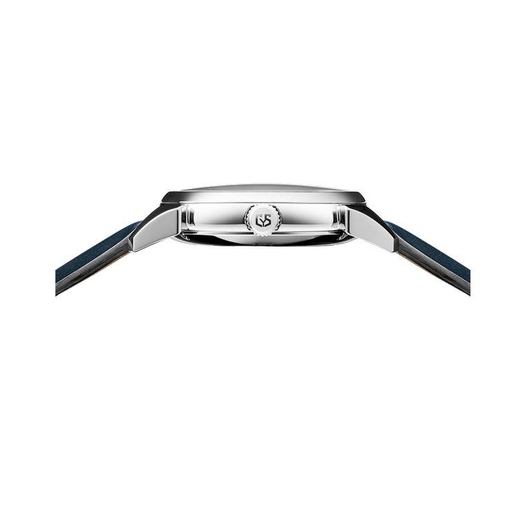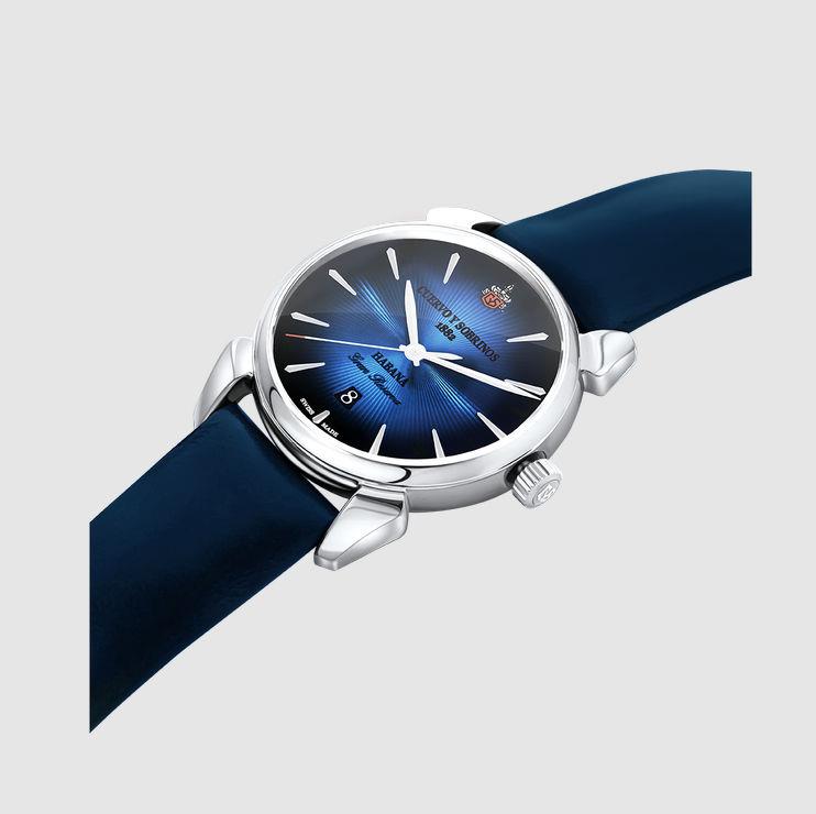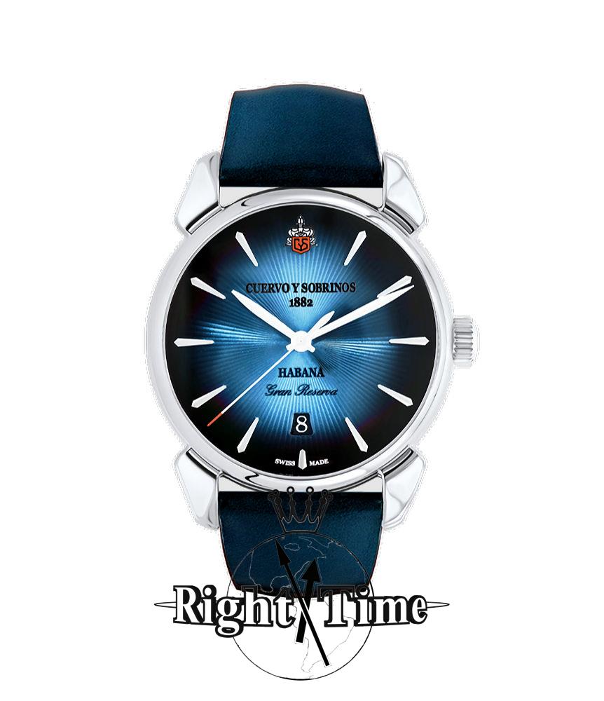 Cuervo Y Sobrinos Historiador Model 3101.1GRB. Classic and elegant automatic watch in stainless steel round case with blue strap. Guilloche smoked blue sunray lacquered dial with date.