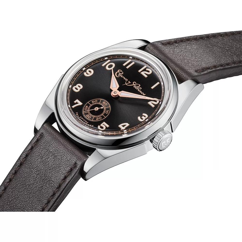Cuervo Y Sobrinos Robusto Sans Souci Model 3162.1N. Water resistant to 50 meters. Swiss automatic watch in stainless steel case. Sapphire crystal. Comes on brown leather strap. Black dial with seconds sub-dial and luminous Arabic markers.