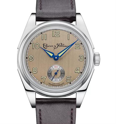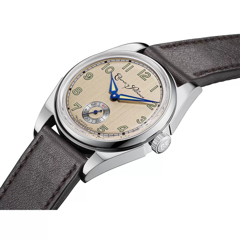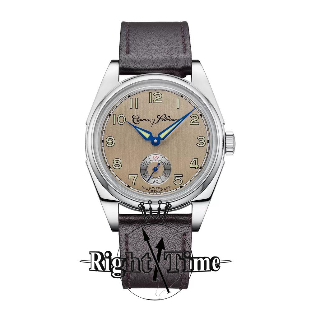 Cuervo Y Sobrinos Robusto Sans Souci Model 3162.1PM. Water resistant to 50 meters. Swiss automatic watch in stainless steel case. Sapphire crystal. Comes on brown leather strap. Champagne color dial with seconds sub-dial and luminous Arabic markers.