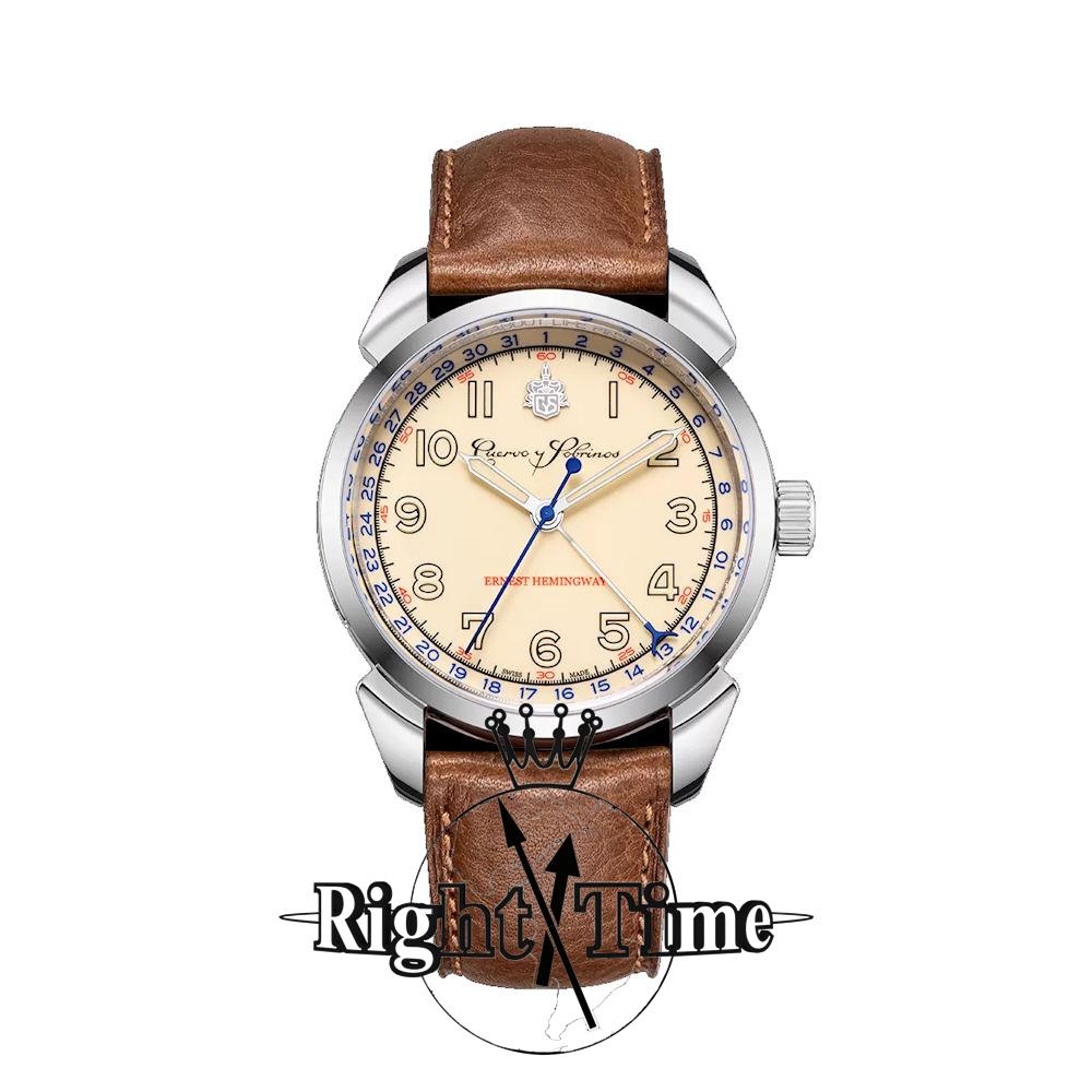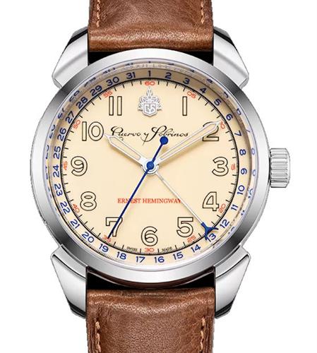 Cuervo Y Sobrinos Historiador Hemingway Iconico Model 3190.1LCC. Limited Edition. tribute to Cuervo Y Sobrinos longtime and loyal customer Ernest Hemingway, celebrated writer and authentic legend of the 20th century. Classic and elegant automatic watch in stainless steel round case with brown strap. Cream color dial with date pointer hand. Comes in unique "Hemingway book-box"