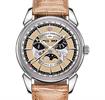Cuervo Y Sobrinos Historiador Luna Model 3194.1LCHS. Classic and elegant automatic watch in stainless steel round case with alligator strap. Sand "Clou de Paris" guilloche skeletonized dial with day/date/month and moon phase calendar. Comes in unique cigar humidor box