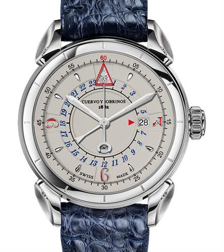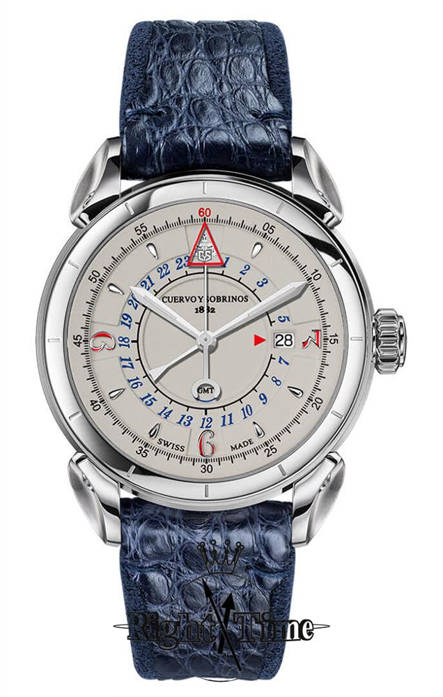 Cuervo Y Sobrinos Historiador "Vuelo GMT" Model 3204.1IGMT. Modern and sophisticated automatic model, powered by Selita SW 330-1 module, housed in polished stainless steel round case with blue alligator strap. Ivory color dial with date and second time zone hand in 24-hours format.