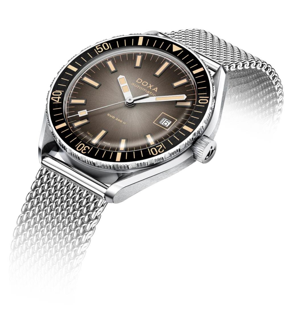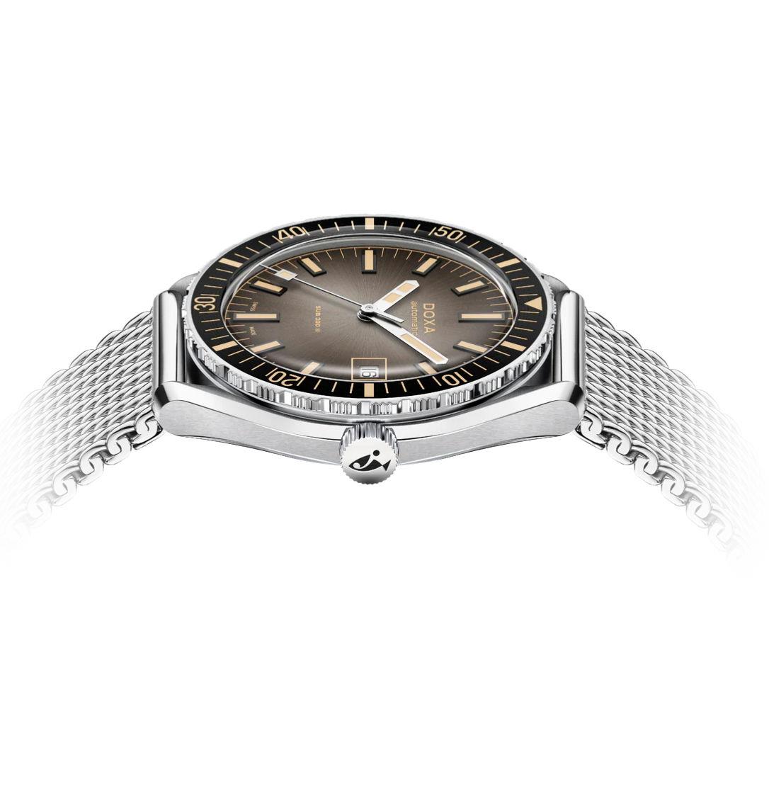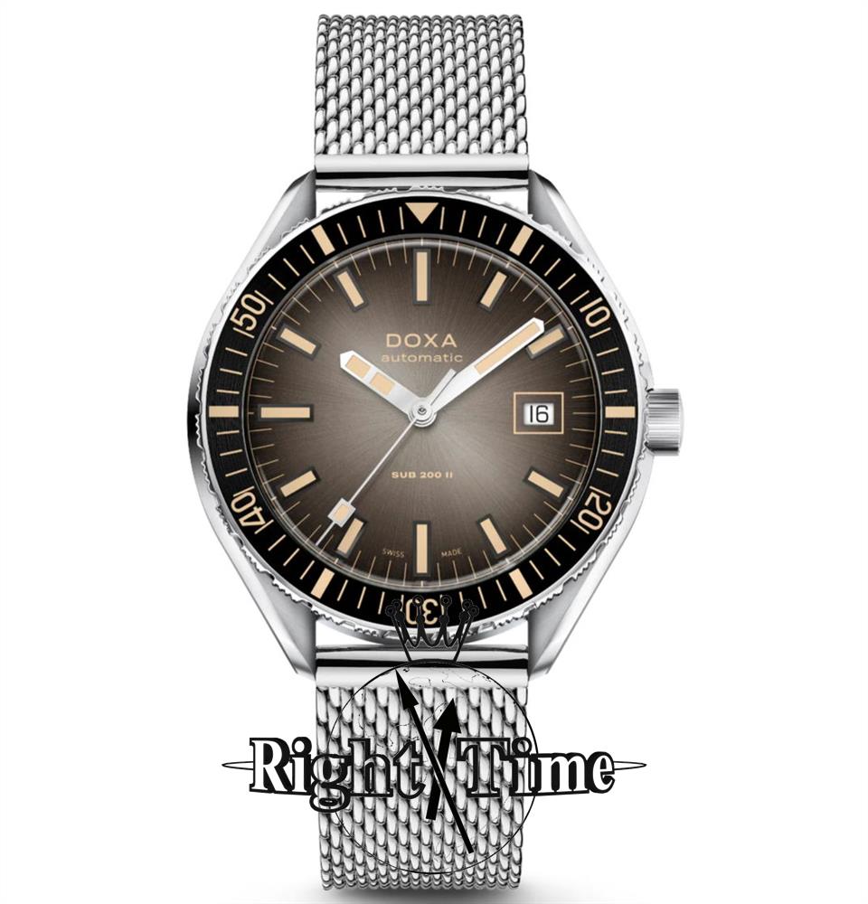 Doxa Sub 200 II Sharkhunter Vintage model 795.10.101B.10. Water resistant to 200 meters. Watch is powered by Swiss mechanical automatic, self-winding movement decorated by Doxa. Black bezel. Grey gradient smoked dial with steel hands. Comes on a bracelet.