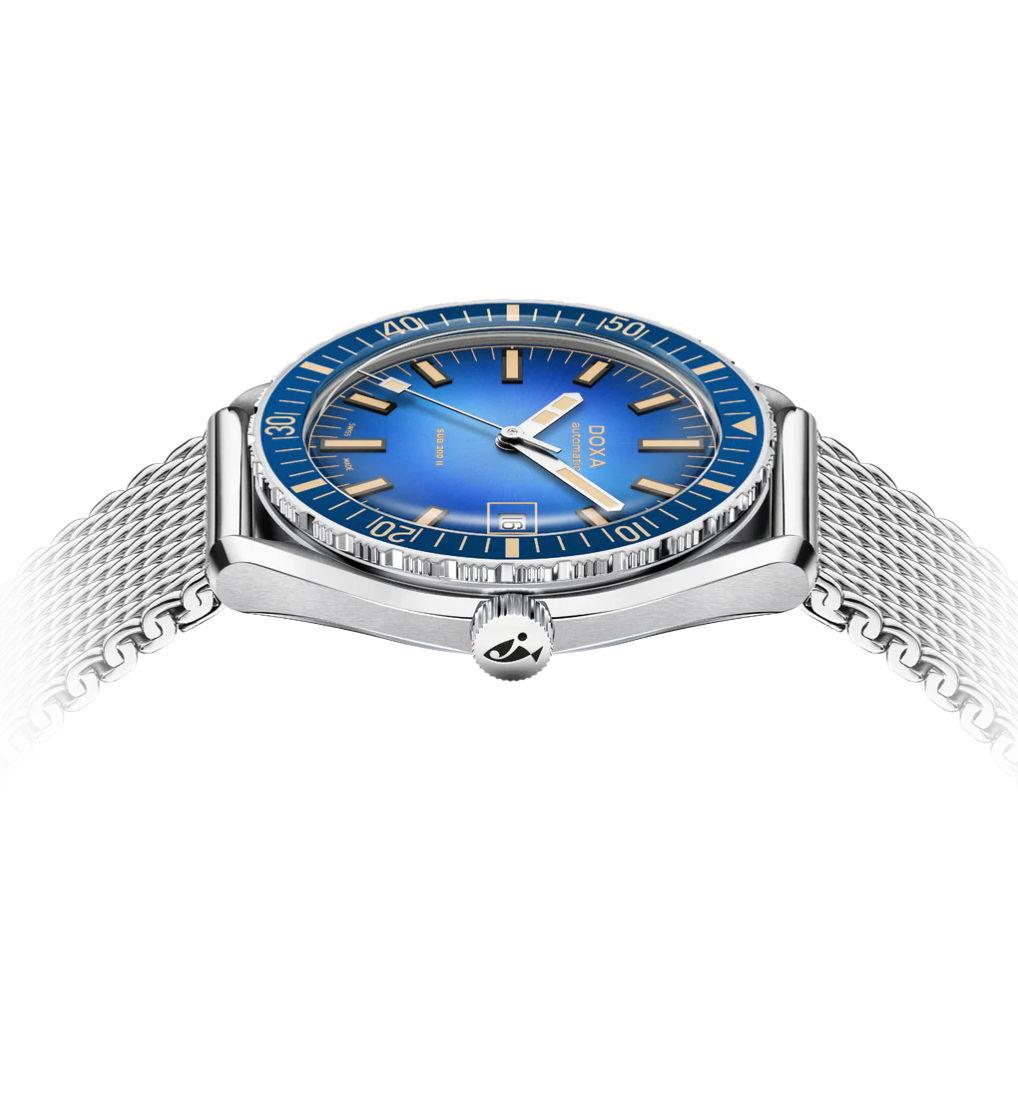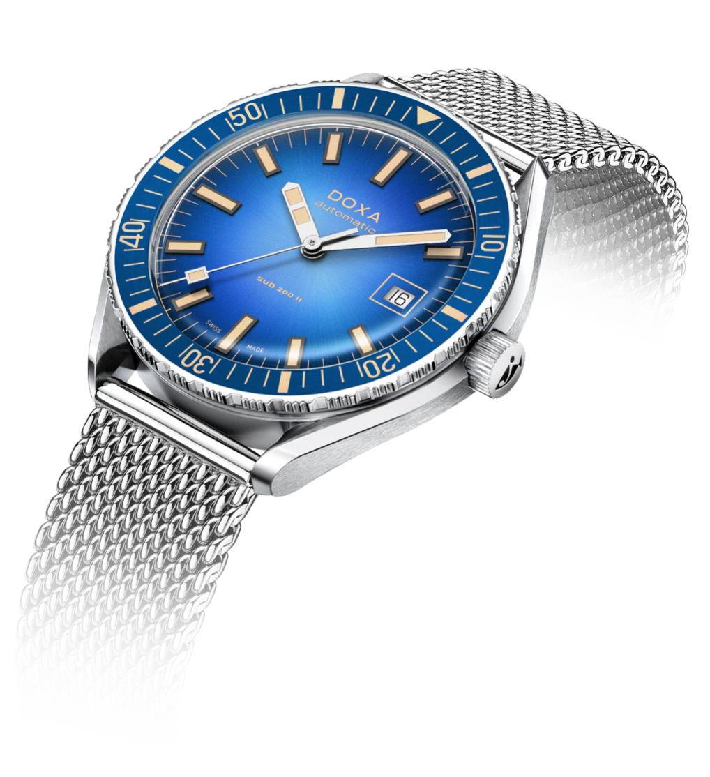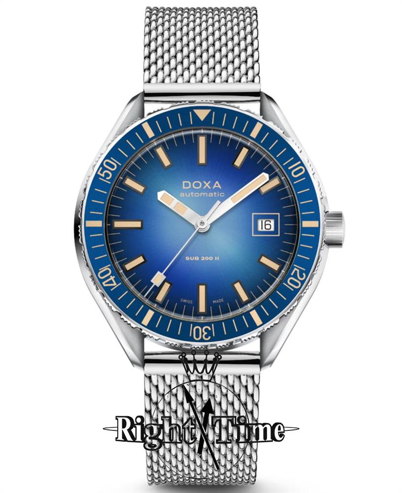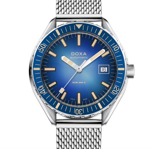 Doxa Sub 200 II Caribbean model 795.10.201.10. Water resistant to 200 meters. Watch is powered by Swiss mechanical automatic, self-winding movement decorated by Doxa. Blue bezel. Blue gradient smoked dial with steel hands. Comes on a bracelet.