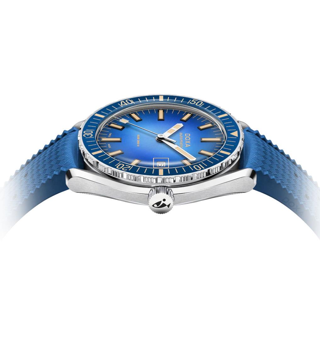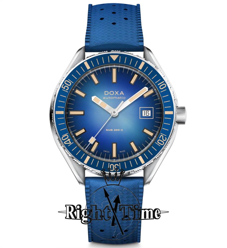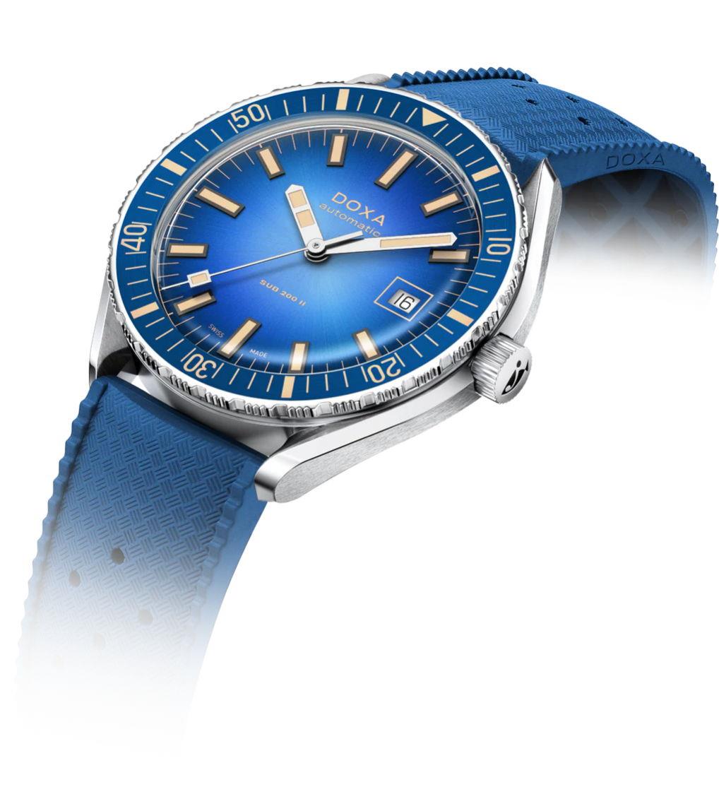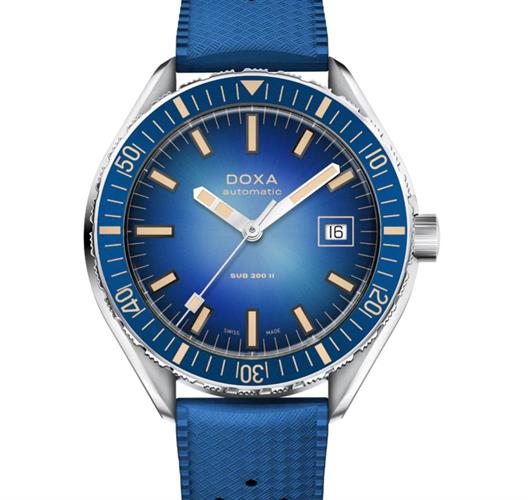 Doxa Sub 200 II Caribbean model 795.10.201.32. Water resistant to 200 meters. Watch is powered by Swiss mechanical automatic, self-winding movement decorated by Doxa. Blue bezel. Blue gradient smoked dial with steel hands. Comes on a blue rubber strap.