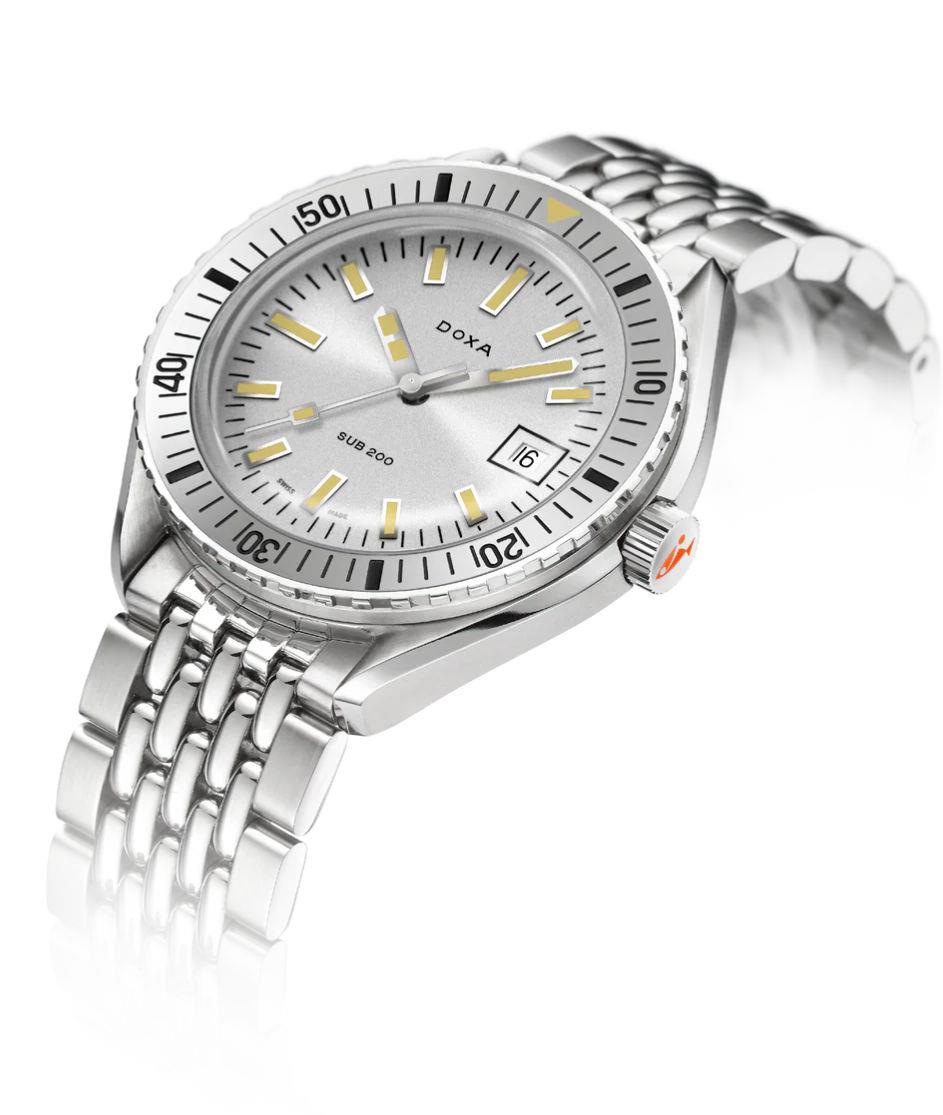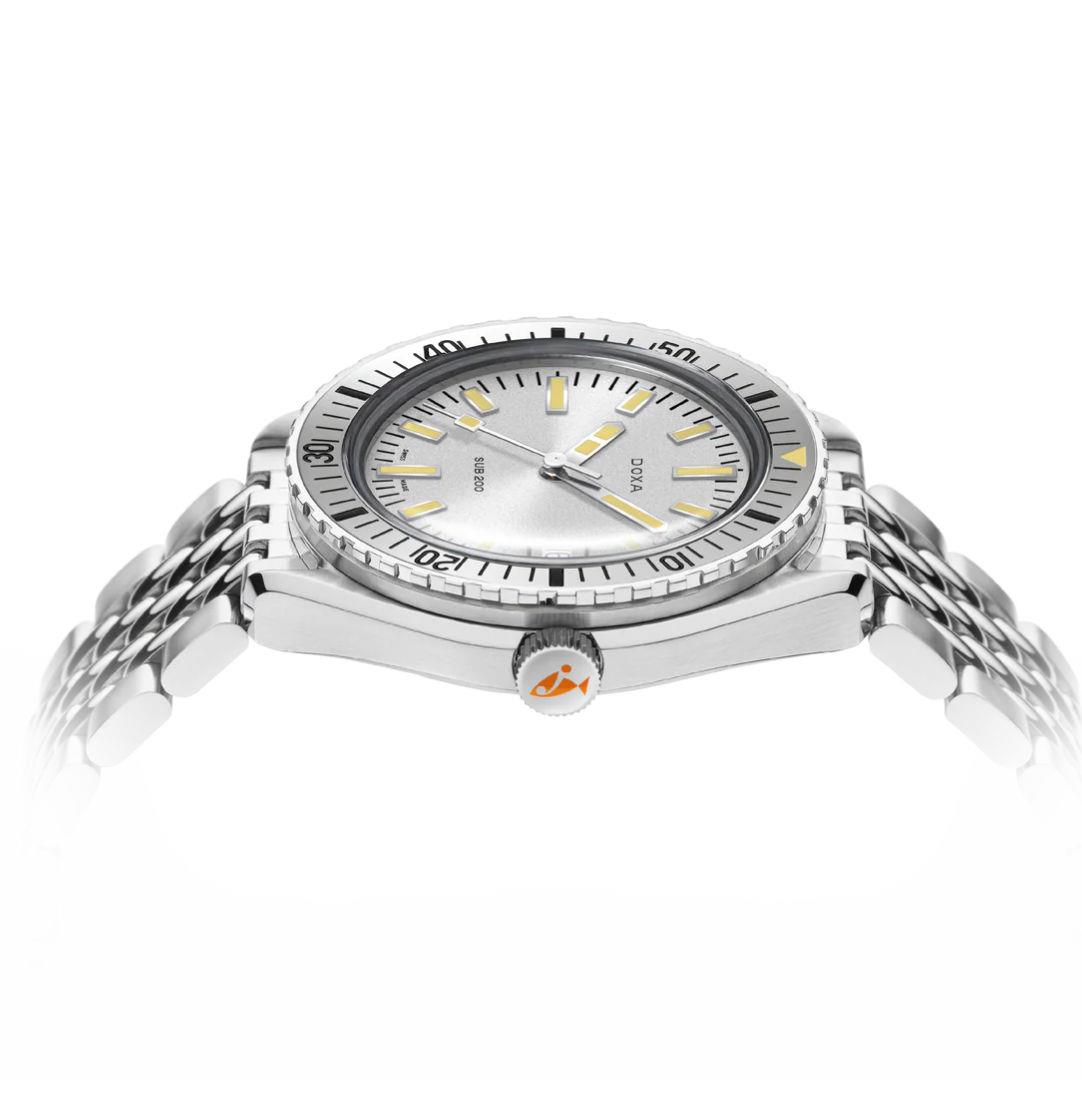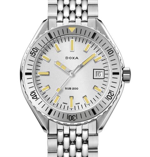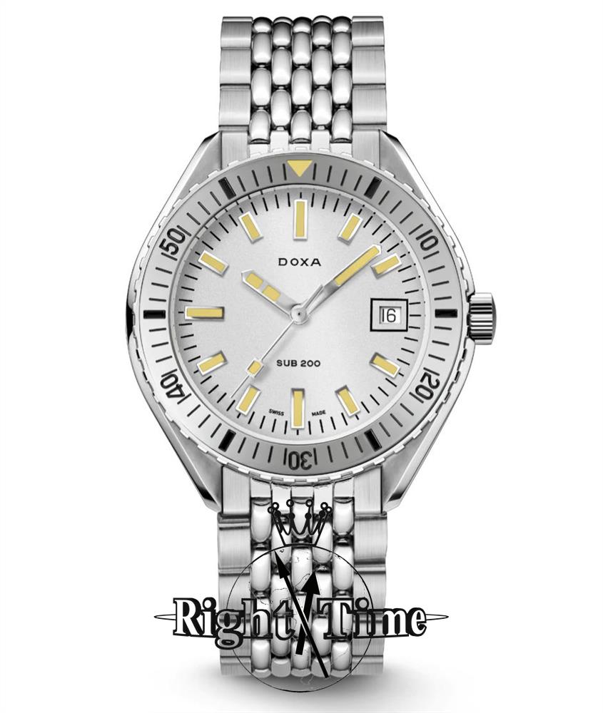 Doxa Sub 200 Searambler model 796.10.021.10. Water resistant to 200 meters. Watch is powered by Swiss mechanical automatic, self-winding movement decorated by Doxa. Silver color dial with steel hands. Comes on a bracelet.