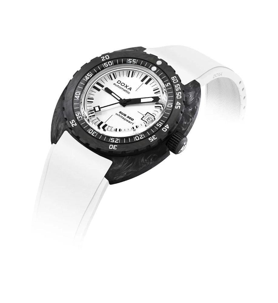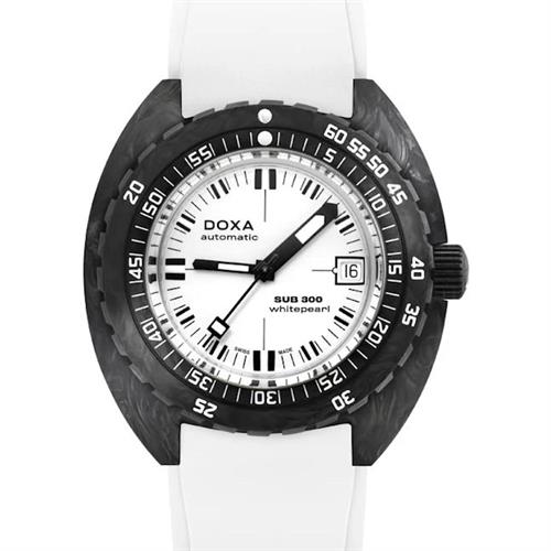 Doxa Sub 300 Carbon Whitepearl model 822.70.011.23. Water resistant to 300 meters. Watch is powered by Swiss mechanical automatic, self-winding, COSC certified Chronometer movement decorated by Doxa. White dial. Comes in a forged carbon case with titanium back, rubber strap, and uni-directional bezel with integrated US Navy no-decompression limit table.