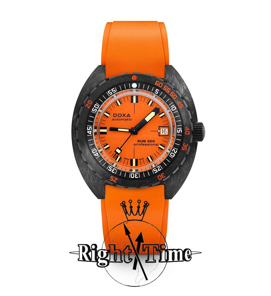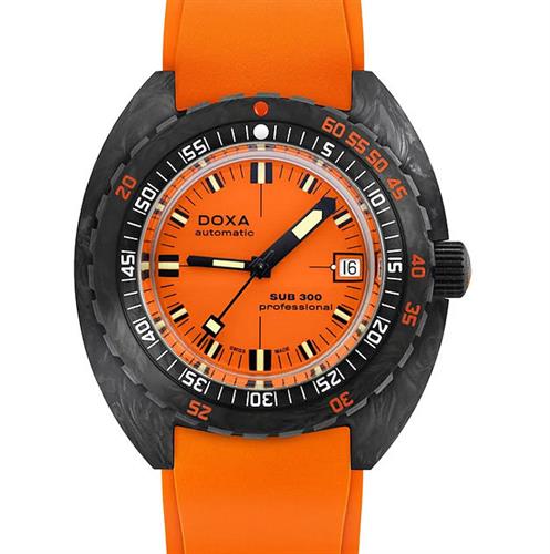 Doxa Sub 300 Carbon Professional model 822.70.351.21. Water resistant to 300 meters. Watch is powered by Swiss mechanical automatic, self-winding, COSC certified Chronometer movement decorated by Doxa. Orange dial. Comes in a forged carbon case with titanium back, rubber strap, and uni-directional bezel with integrated US Navy no-decompression limit table.