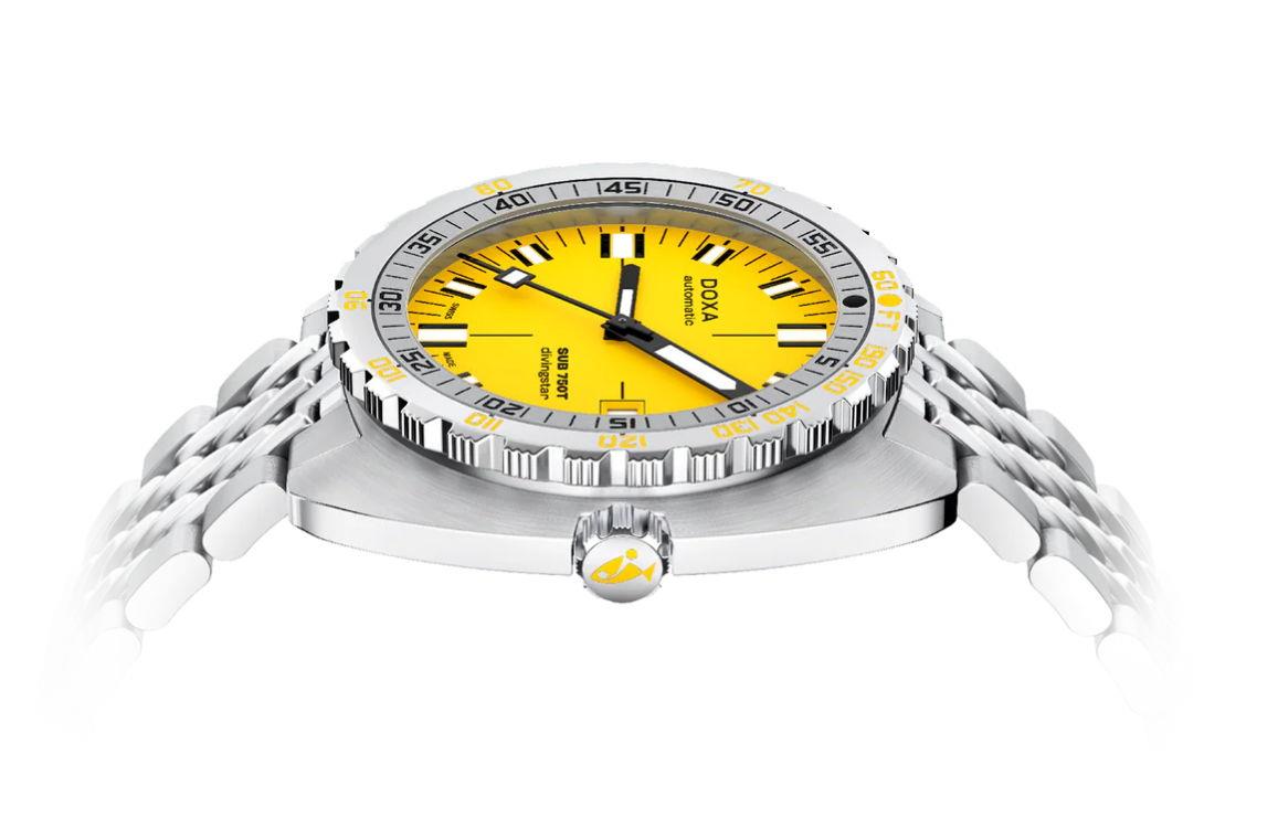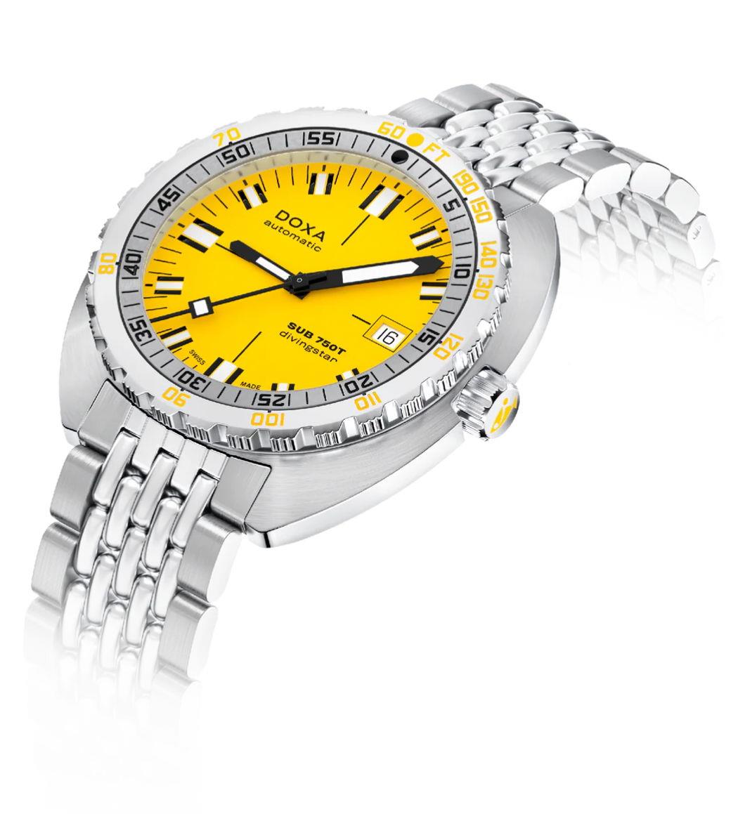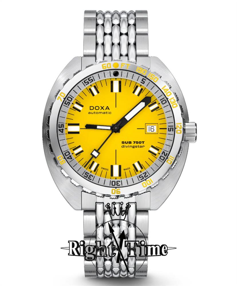 Doxa Sub 750T Professional model 825.10.361.10. Water resistant to 750 meters. Watch is powered by Swiss mechanical automatic, self-winding movement decorated by Doxa. Yellow color dial. Comes in a steel case with a bracelet and uni-directional bezel with integrated US Navy no-decompression limit table.