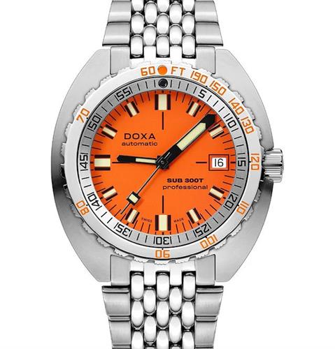 Doxa Sub 300T Professional model 840.10.351.10. Water resistant to 1200 meters. Watch is powered by Swiss mechanical automatic, self-winding movement decorated by Doxa. Orange dial. Comes in a steel case with a bracelet and uni-directional bezel with integrated US Navy no-decompression limit table.