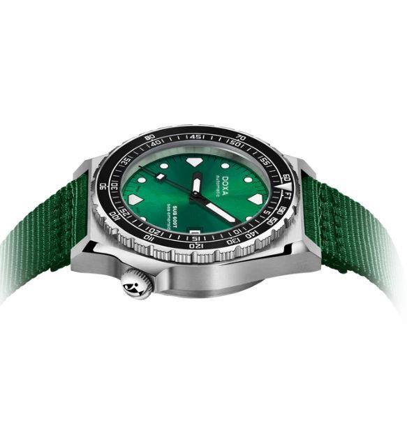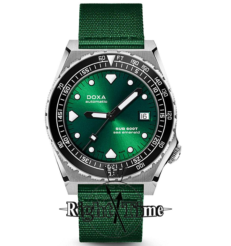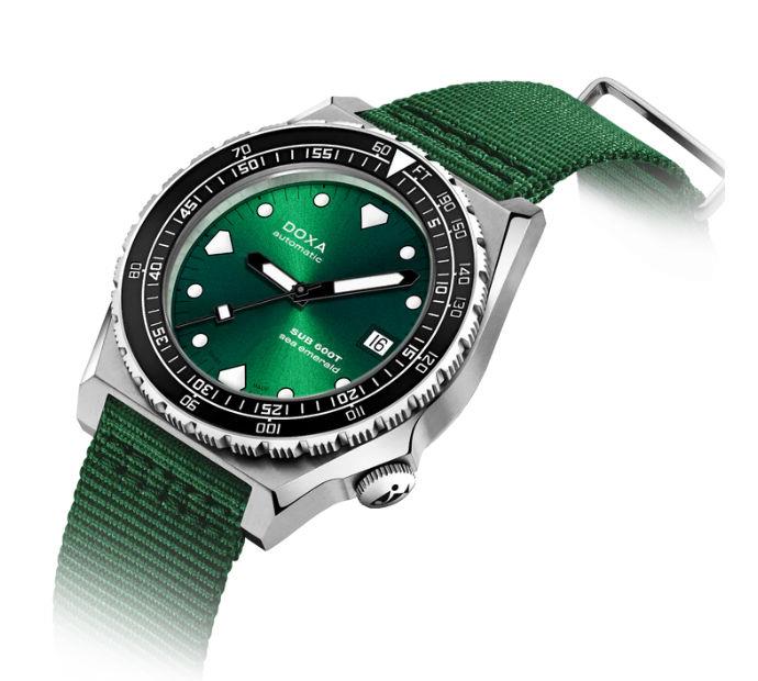 Doxa Sub 600T Professional model 861.10.131.26-N. Water resistant to 600 meters. Watch is powered by Swiss mechanical automatic, self-winding movement decorated by Doxa. Emerald green dial. Comes in a steel case with a green nylon strap and uni-directional bezel with integrated US Navy no-decompression limit table.