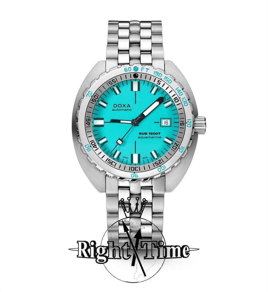 Doxa Sub 1500T Aquamarine model 883.10.241.10. Water resistant to 1500 meters. Watch is powered by Swiss mechanical automatic, self-winding movement decorated by Doxa. Aquamarine blue dial. Comes in a steel case with a bracelet and uni-directional bezel with integrated US Navy no-decompression limit table.