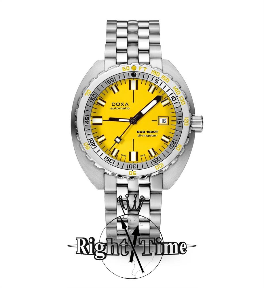 Doxa Sub 1500T Divingstar model 883.10.361.10. Water resistant to 1500 meters. Watch is powered by Swiss mechanical automatic, self-winding movement decorated by Doxa. Yellow dial. Comes in a steel case with a bracelet and uni-directional bezel with integrated US Navy no-decompression limit table.
