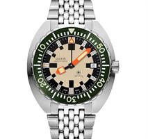 Doxa Army, stainless steel bezel model 785.10.031G.10. Water resistant to 300 meters. Watch is powered by Swiss mechanical automatic, self-winding movement decorated by Doxa. Beige and black dial with orange hands. Green 0-60 bezel. Comes on a stainless steel "beads of rice" bracelet with folding clasp and exclusive "DOXA fish" symbol. An additional NATO camouflage strap is included. Special case features the original camouflage pattern of the field uniform worn at the time by the Swiss Army.