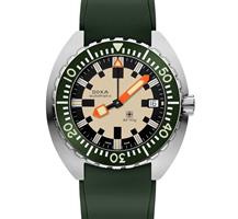 Doxa Army, stainless steel bezel model 785.10.031G.26. Water resistant to 300 meters. Watch is powered by Swiss mechanical automatic, self-winding movement decorated by Doxa. Beige and black dial with orange hands. Green bezel. Comes on a green rubber band with folding clasp and exclusive "DOXA fish" symbol. An additional NATO camouflage strap is included. Special case features the original camouflage pattern of the field uniform worn at the time by the Swiss Army.