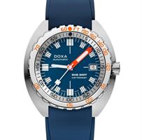 Doxa Sub 200 Whitepearl model 799.10.011.23. Water resistant to 200 meters. Watch is powered by Swiss mechanical automatic, self-winding movement decorated by Doxa. White dial with black hands. Comes on a white rubber strap.
