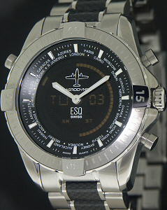 ESQ Aerodyne wrist watch with combination analog and digital movement. Stainless steel case with uni-directional 0-60 bezel. World cities on inner bezel. Stainless steel watch bracelet with black carbon fiber accents. Watch Functions: World time, Alarm, Date
