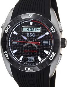 ESQ Octane Sport wrist watch with combination analog and digital movement. Stainless steel case with black plated bezel. Black carbon fiber dial with digital display. Black rubber watch band. Watch Functions: Alarm, Chronograph, Date