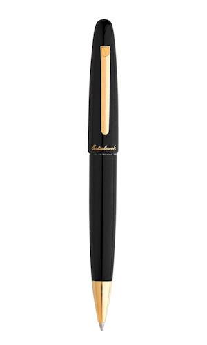 Esterbrook Estie Ebony Black ball point pen with gold trim. Size 5.9" closed, 5" open, 6.7" posted.