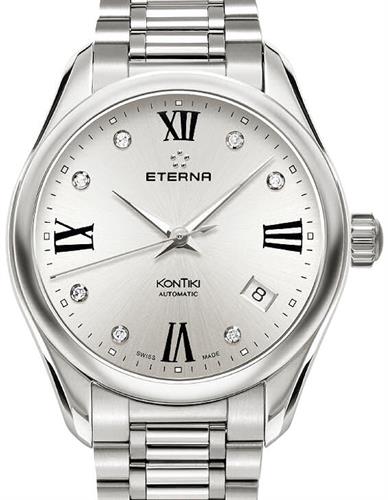 Eterna Lady Kontiki Automatic 36mm watch model 1260.41.16.1731. Water resistant to 100 meters. Powered by Swiss automatic movement. Brushed and polished stainless steel case and bracelet. Silver color dial with date calendar, Roman and diamond markers.