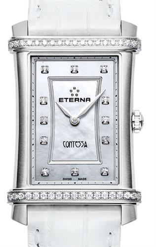 Eterna Ladies Contessa Two-Hands watch model 2410.48.67.1247. Powered by Swiss ETA quartz movement. Stainless steel case with 46 Top Wesselton diamonds. White Mother-of-Pearl dial with 12 diamond markers. White Louisiana alligator leather strap.